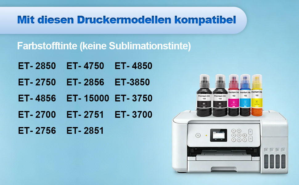 E102 Tinte Kompatibel für Epson Drucker zur Verwendung mit: Epson ET-15000 ET-2700 ET-2750 ET-2750 Unlimited ET-2751 ET-2756 ET-2850 ET-2851 ET-2856 ET-3700 ET-3750 ET-3750 Unlimited ET-3850 ET-4750 ET-4750 Unlimited ET-4850 ET-4856
